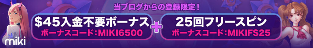 Mikiに登録する際には、ぜひ本ブログのリンクを利用しましょう。そうすることで、45ドルのMikiカジノ入金不要ボーナスをもらうことができます。